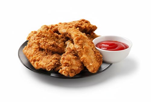 Poulet crousty maison (100% filet), riz. Sauces Blanche et Thaï, oignons croquants.